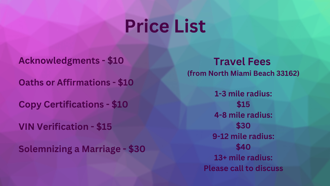 Acknowledgment, Oath or Affirmation (Jurat), VIN verification, Notarized copies, Self-proof of wills/trusts, Consent forms for minors, Other misc. medical, legal and business documents